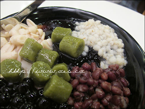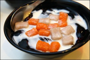 Pierwszy z nich, bestseller na zimno: kruszony lód wymieszany z jakimś wywarem z owocu/warzywa, polany „grass jelly” czyli galaretką z trawy, koloru czarnego. Na tym kilka kawałków poduszeczek zrobionych z taro (azjatycka roślina bulwiasta, coś jak ziemniak). Całość można było dodatkowo polać śmietanką. Smakowało to wszystko ciekawie, zwłaszcza poduszeczki z taro- przypominały mi polskie kopytka.