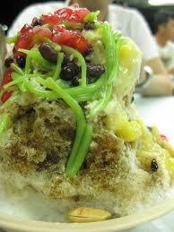 Bohaterem dzisiejszego dnia jest ABC, czyli malajski deser lodowy. Składa się z kruszonego lodu polanego syropem, żelków, kukurydzy gotowanej, czerwonej fasolki, orzeszków arachidowych, zielonych pędów rośliny malajskiej (nie znam nazwy) i pędów brązowych. W smaku – zaskakująco mało słodkie, zdecydowanie muszę się przyzwyczaić do ichnich nie-słodkich słodyczy. A fasolka i kukurydza smakują jak fasolka i kukurydza 😛 Jak dla mnie mogłoby ich nie być, ale da się zjeść.