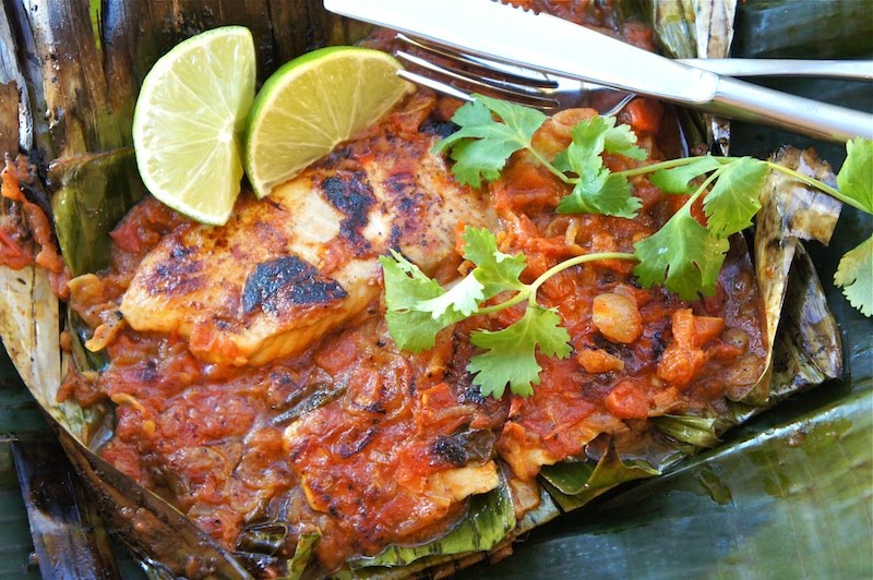 ryba pieczona na liściu bananowca (dobre, ale z bardzo ostrym sosem!)