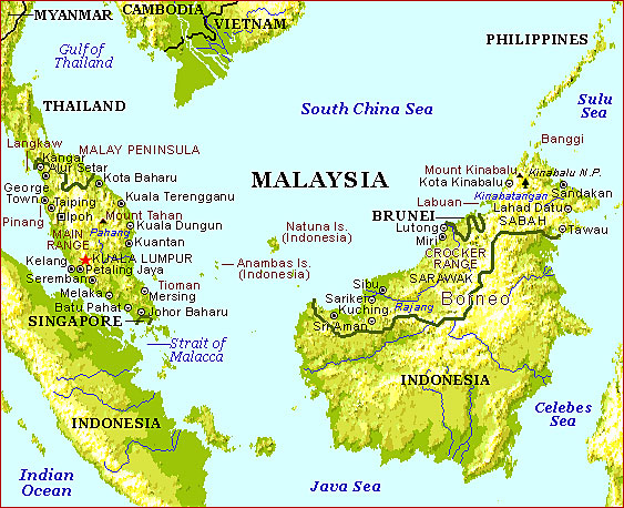 Poniżej jeszcze mapka Malezji (podobną zainstalowałam sobie w wersji papierowej na ścianie pokoju, zamierzam na niej zaznaczać miejsca które odwiedziłam). Kuala Lumpur znajduje się w południowo-zachodniej części półwyspu.