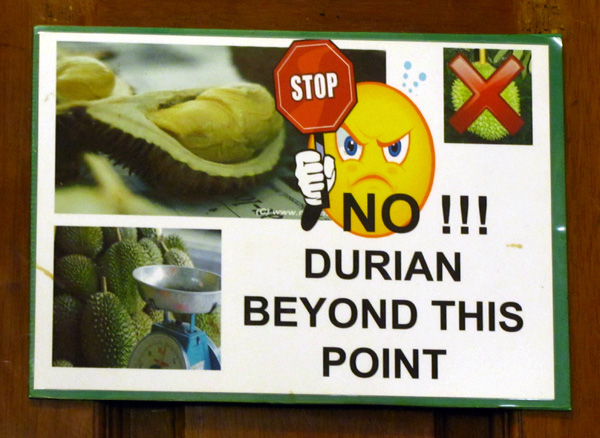 Same duriany sprzedaje się wyłącznie na targowiskach albo z wózków umieszczonych gdzieś na świeżym powietrzu. Powód jest prosty: durian przeokropnie śmierdzi! Silny odór, utrzymujący się w ustach i na ubraniu nawet 2 dni po zjedzeniu zmusił Malajów do wywieszenia w wielu miejscach takiej tabliczki: