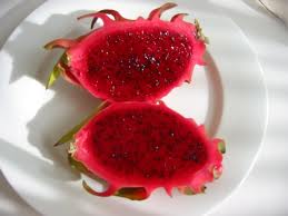 Po przekrojeniu na pół wyjada się go łyżeczką ze środka, przez co skojarzył mi się nieco z kiwi. Zresztą malutkie pesteczki w środku też ma podobne do kiwi. Jest bardzo soczysty i chlupie ciemnoróżowym sokiem, silnie barwiącym. W smaku dość słodki, całkiem mi smakował. Dzisiejszy smoczy owoc był różowy w środku, jest jeszcze opcja biała, podobno nie tak smaczna – ale i tak chcę spróbować.