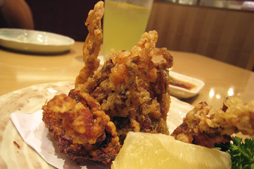 Krab – to właściwie typ „soft shell crab”, czyli wyciągnięty ze zbiornika wodnego chwilę po tym, jak zrzucił pancerzyk, aby wymienić go na nowy. Nie ma więc problemu z dłubaniem w skorupce. Nie surowy, a smażony w panierce. Pyszności!