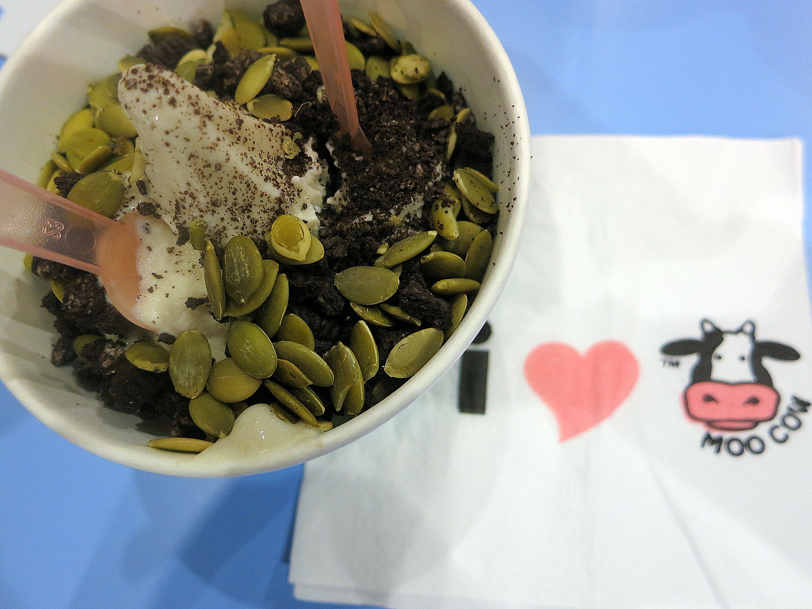 Przed wejściem stała spora kolejka głodnych klientów, więc na przeczekanie kupiliśmy sobie małą porcyjkę mrożonego jogurtu naturalnego, posypanego kruszonymi ciasteczkami oreo i pestkami dyni. Całkiem smaczny, smakuje jak mrożony jogurt Fantasia z dodatkami, taki kremowy i lekko słodki.