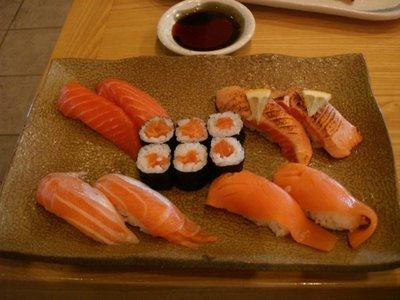 Sushi z łososiem – dobre, łącznie 12, z czego 2 sztuki zawierały nawet niesurową (gotowaną na parze) rybę. Po umoczeniu w sosiku słodko-słonym z dodatkiem chrzanu wasabi smakowało to całkiem-całkiem. Ale ryż był naprawdę fantastyczny!
