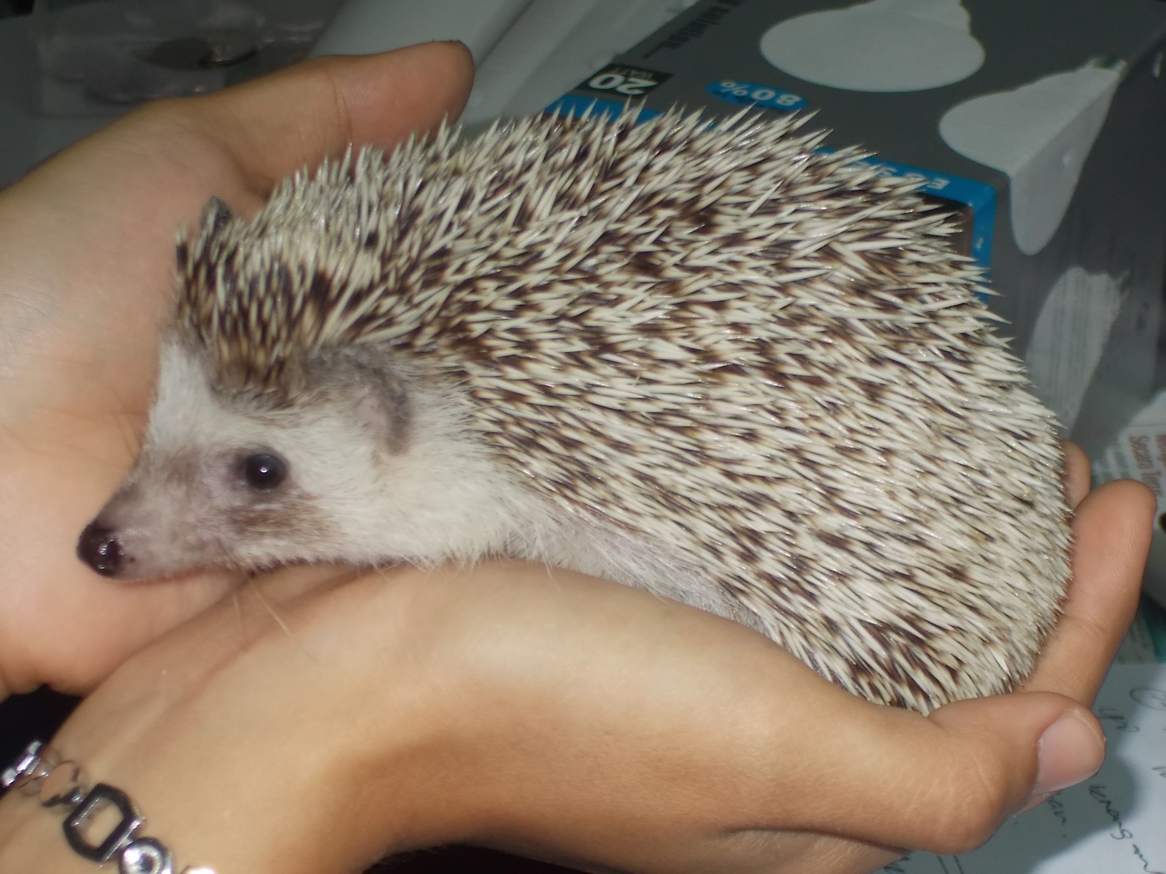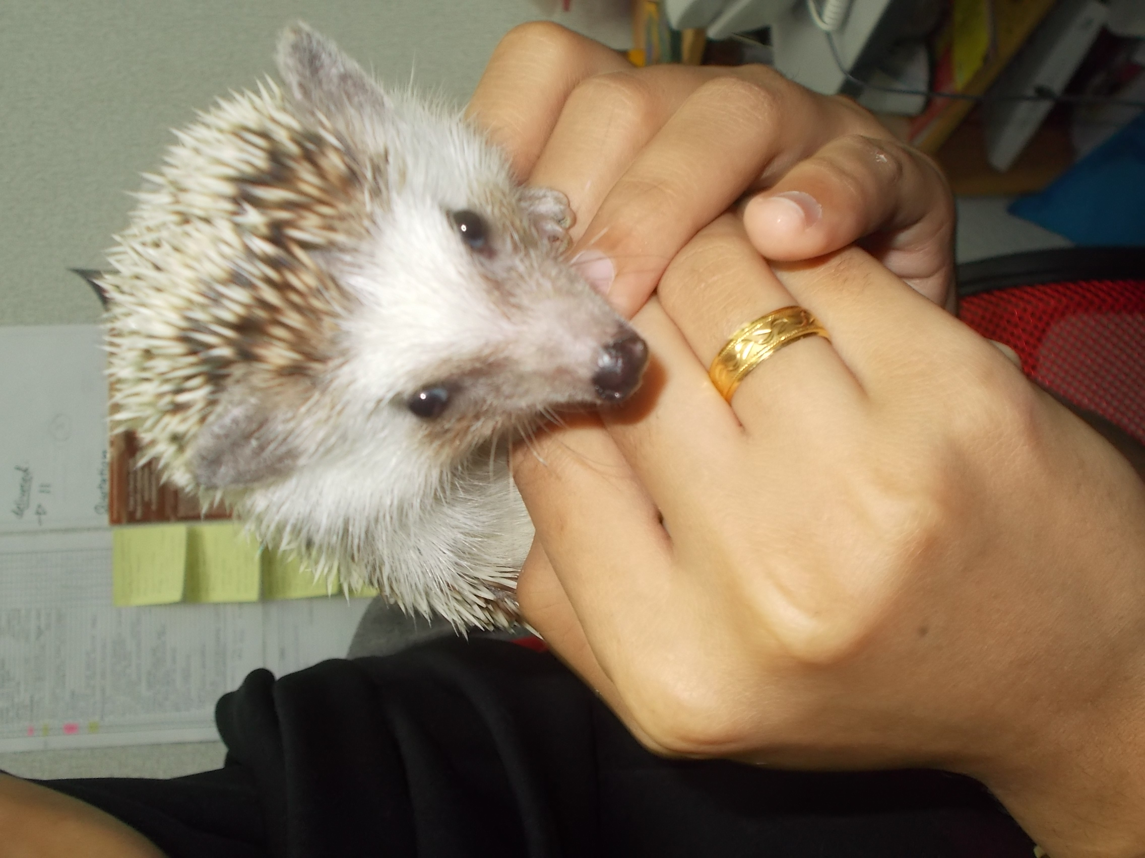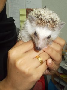 Koleżanka z pracy dostała go od poprzedniego właściciela, który „znudził się” zwierzątkiem… I od dziś jeżyk będzie nam towarzyszył w biurze w ciągu dnia, jako że Jiha nie chce zostawiać go samego w domu.
