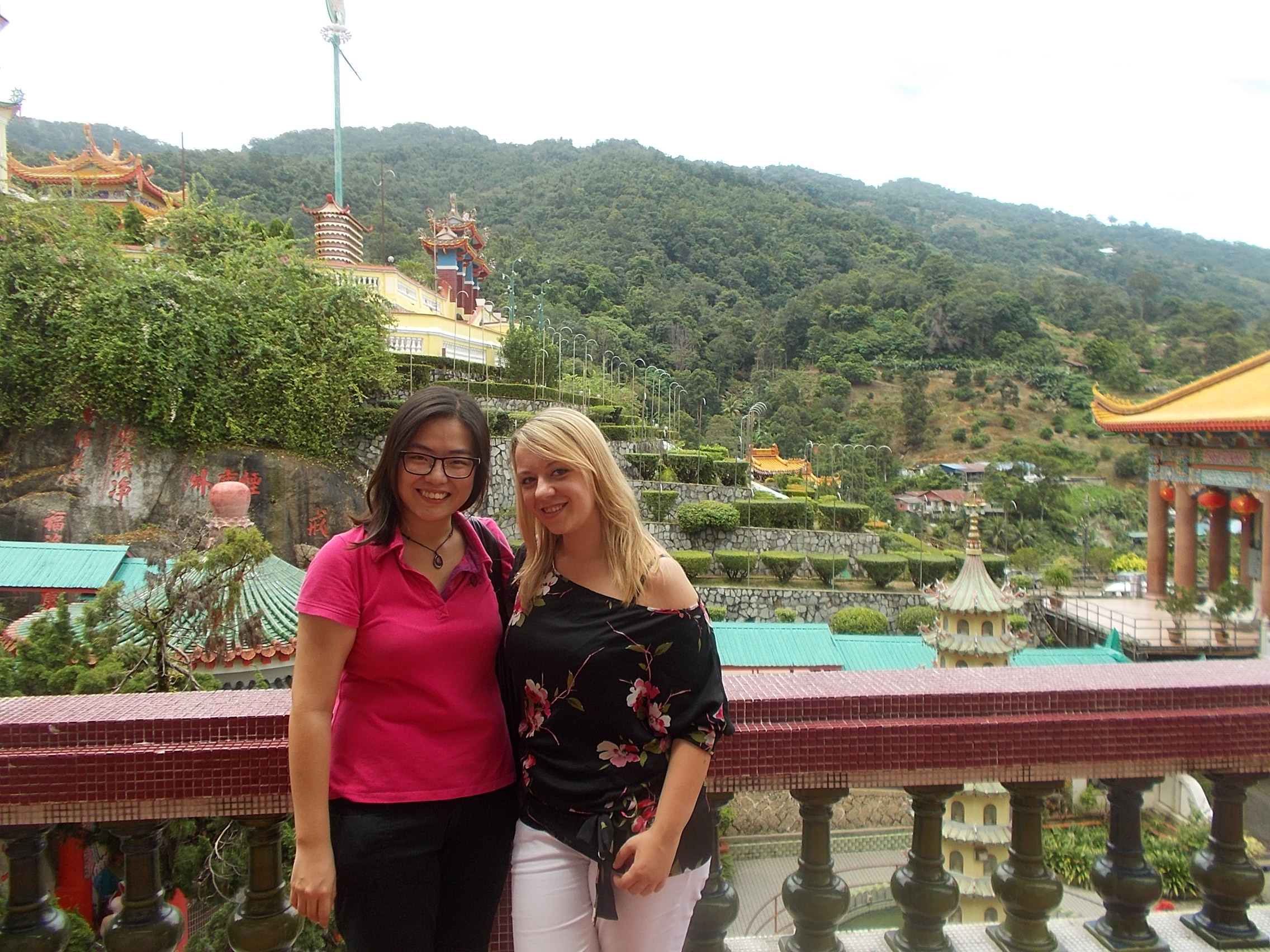 Nadmienię tutaj, że Penang z racji swojego wyspiarskiego położenia jest bardzo wilgotnym miejscem (i ciepłym), a pada tu średnio co 2 godziny. Wchodzenie po schodach na wzgórze jest więc nie lada wysiłkiem, jako że aura nie jest zbyt sprzyjająca i po 5 minutach wszyscy są już mokrzy.
