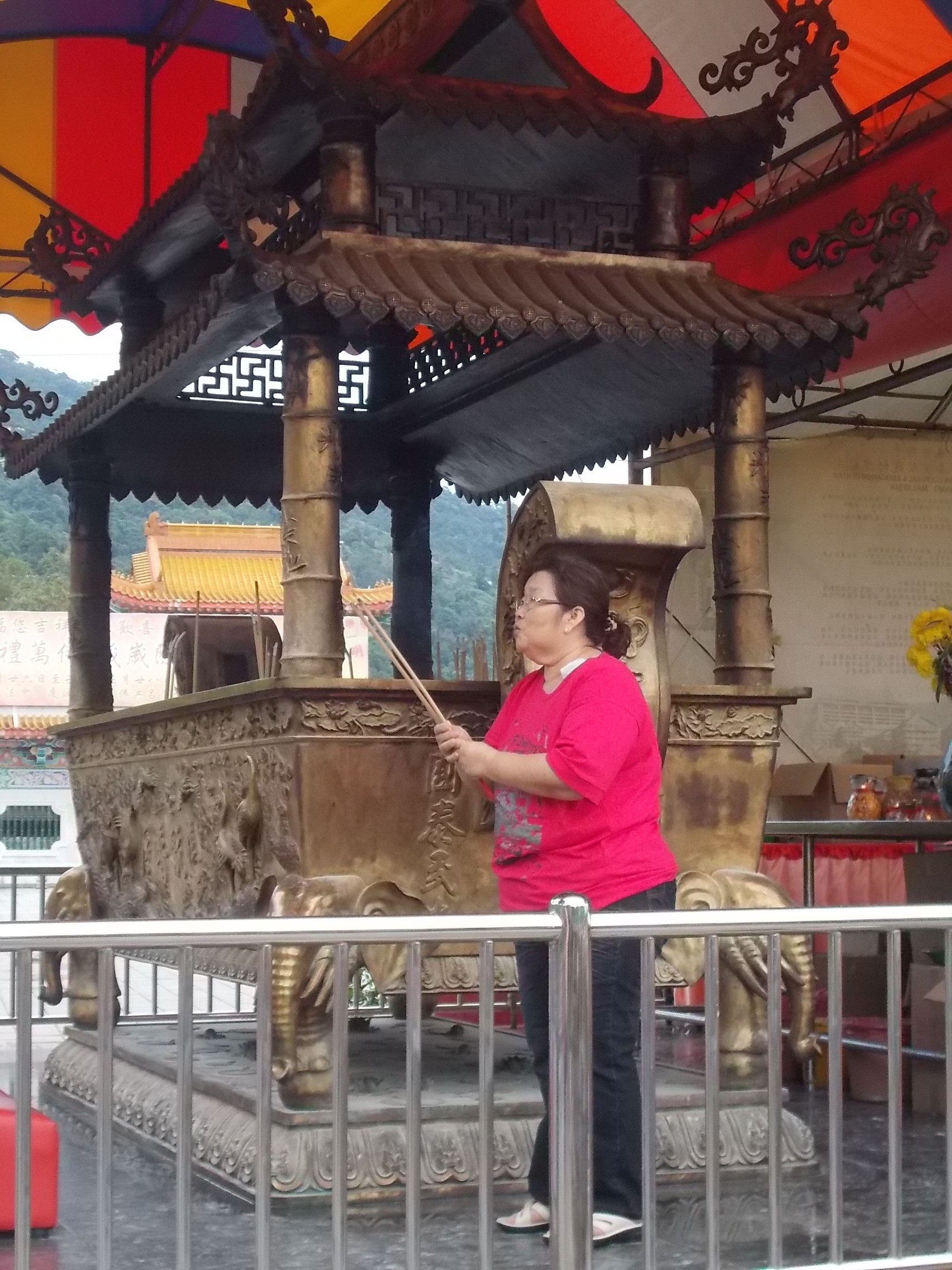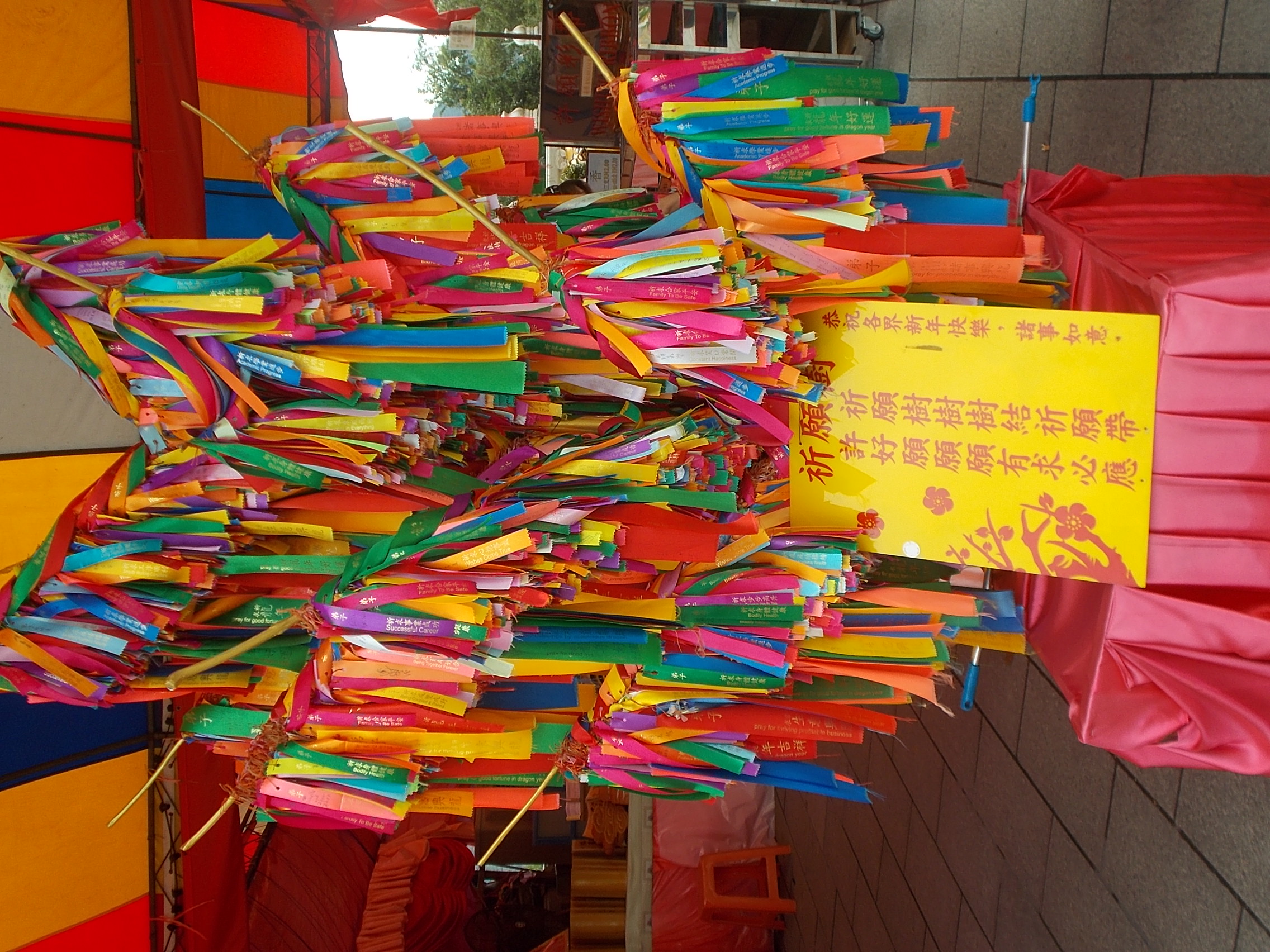 W pagodzie znajduje się też „drzewo życzeń” na którym zawiesza się kolorowe wstążki. Należy wybrać odpowiedni kolor wstążki- zielony to „pokój na ziemi”, czerwony: „powodzenie w biznesie”, pomarańczowy „szczęście rodzinne” i zapłacic 1 RM. Następnie długopisem oznakowuje się wstążkę swoim imieniem i wiesza na drzewku. Podobno gwarantuje to, że życzenie się spełni. No, zobaczymy 🙂