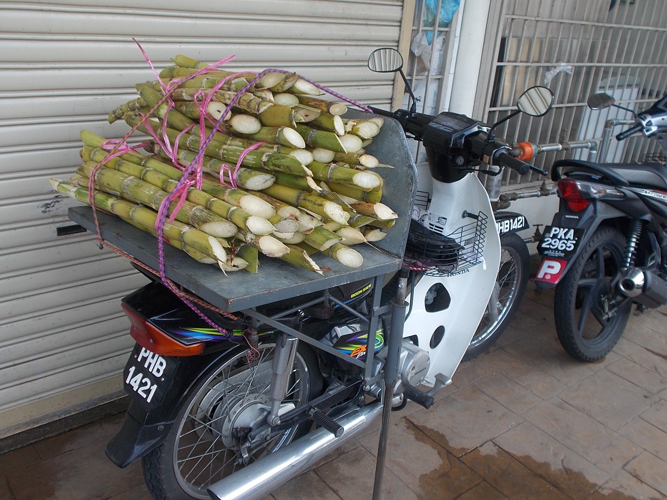 Kolejny przystanek kulinarny, zaraz pod świątynią: zupa Laksa! Czyli bazująca na wywarze rybnym, kwaśna zupka zawierająca kluski, jakieś liście, dużo przypraw, pokrojonego w paski ogórka i chilli. Smaczne! Własnie z powodu tej niespodziewanej kwaśności (nie wiem, co ją nadaje, chyba zioła). Do tego sok z trzciny cukrowej, dopiero co dostarczonej na motorze.