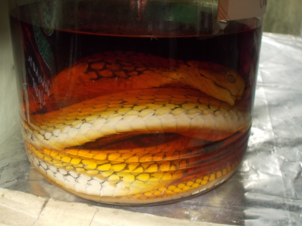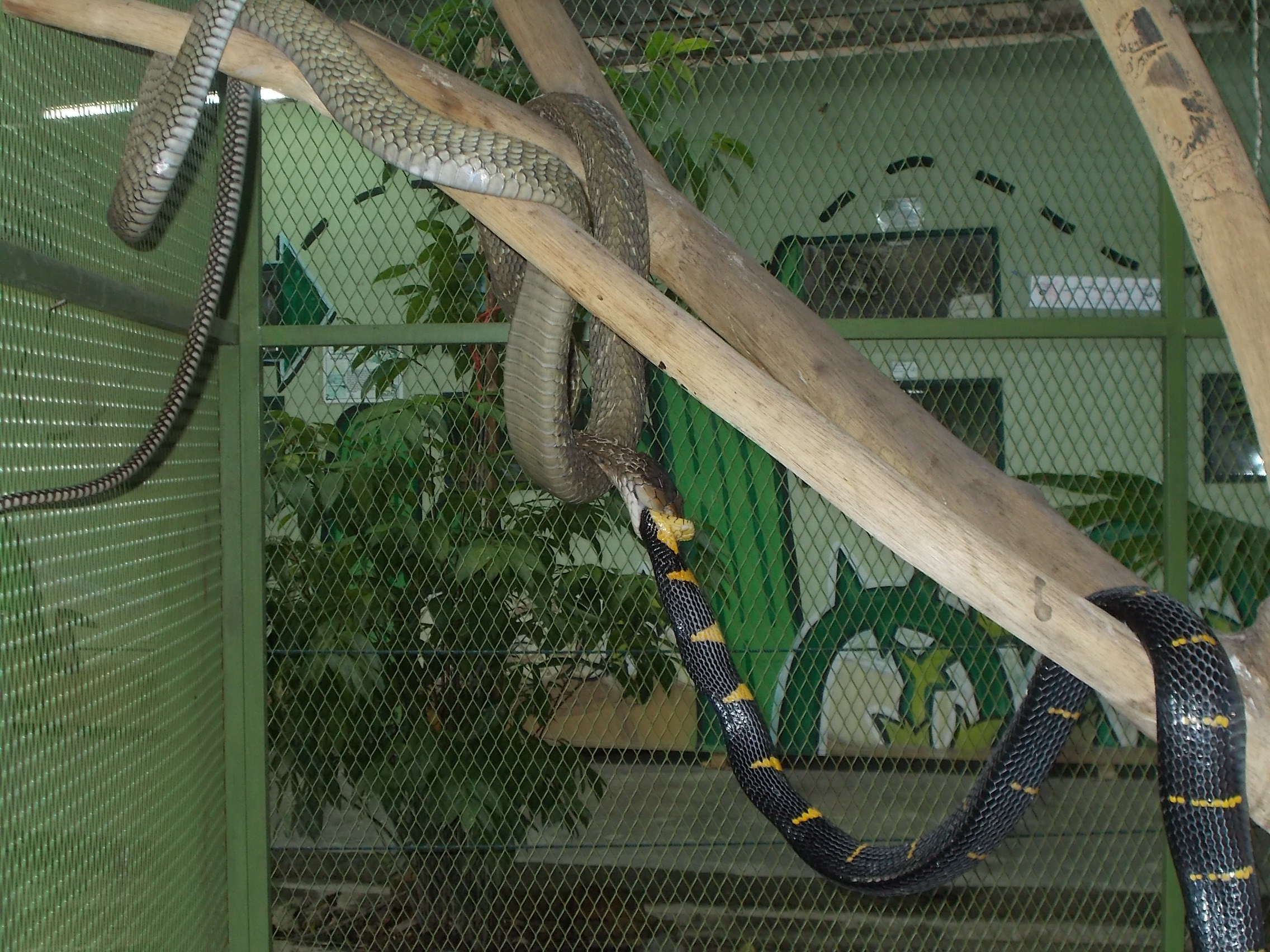 A to „Król węży” – gatunek żywiący się wyłącznie innymi wężami. Miałyśmy szczęście, trafiłyśmy akurat na dzień karmienia. Na zdjęciu szary wąż powoli połyka czarno-żółtego (który jeszcze żyje, wciąż ruszał ogonem).