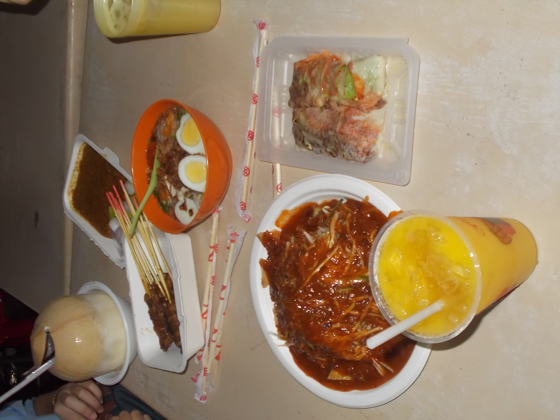 A to nasza kolacja: kluski z krewetkami w zupie, pasembor- smażone tofu i mięso polane sosem z kiełkami, rojak – surowe owoce(mango, jabłko itp) polane sosem sojowym z orzeszkami, smażone skórki z kurczaka i małe ośmiorniczki. Do tego satay i popiah – moje ulubione dania, jeszcze z KL!