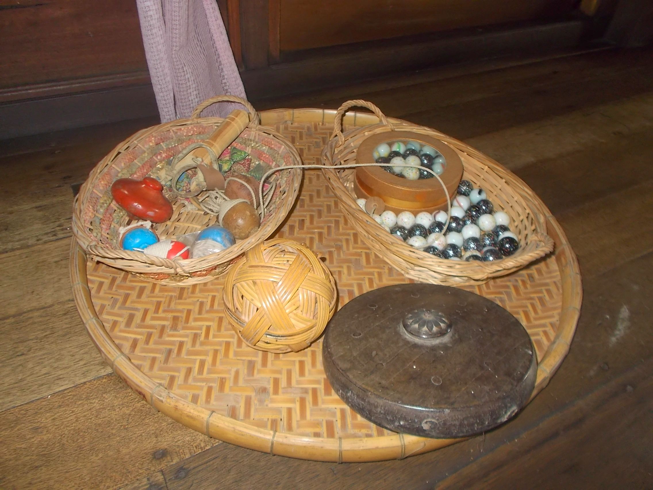 Tradycyjne gry malezyjskie. Ciemny krążek u dołu to bączek, w Malezji nie jest traktowany jako zabawka dla najmłodszych, ale jak gra dla dorosłych.