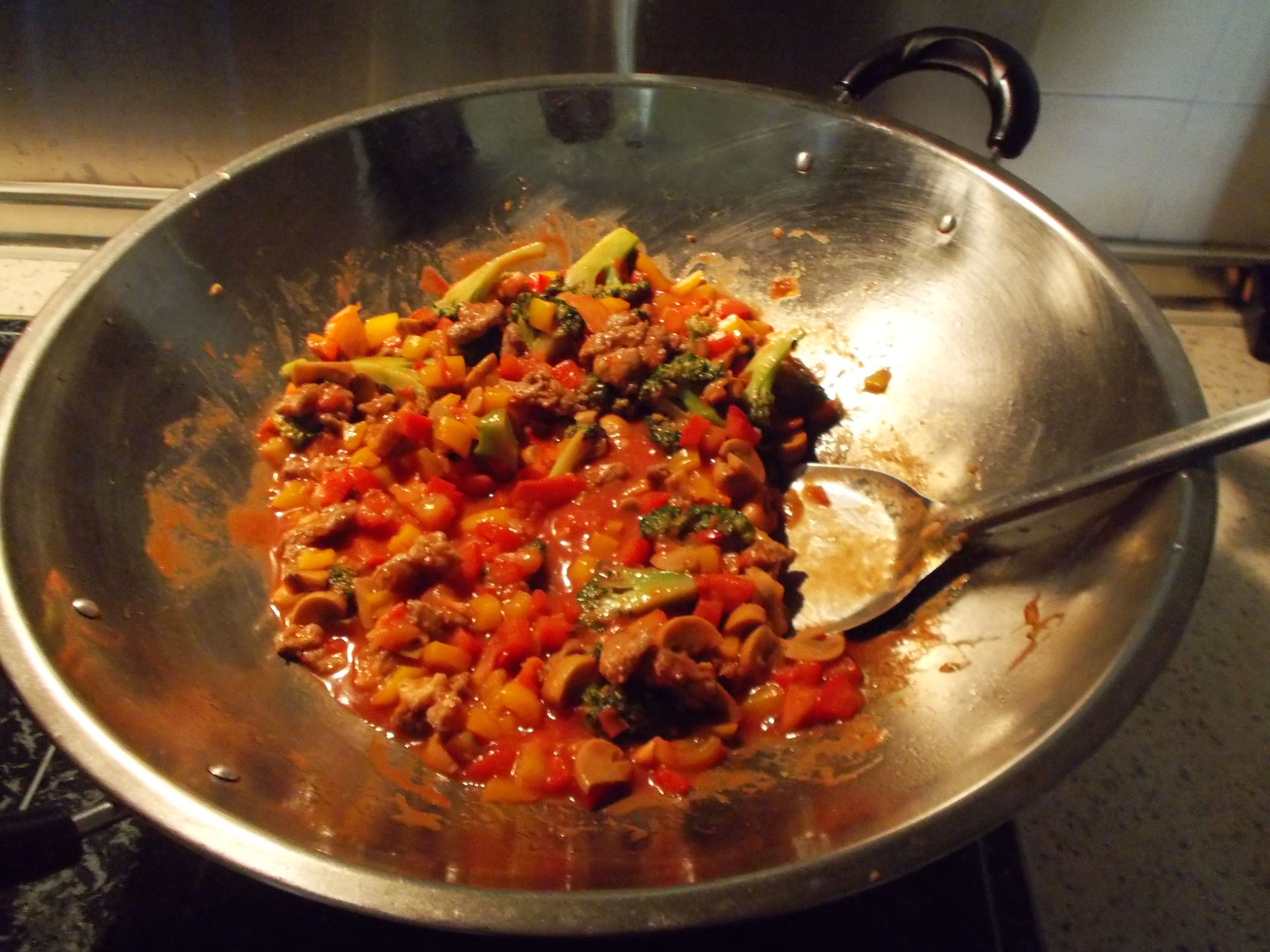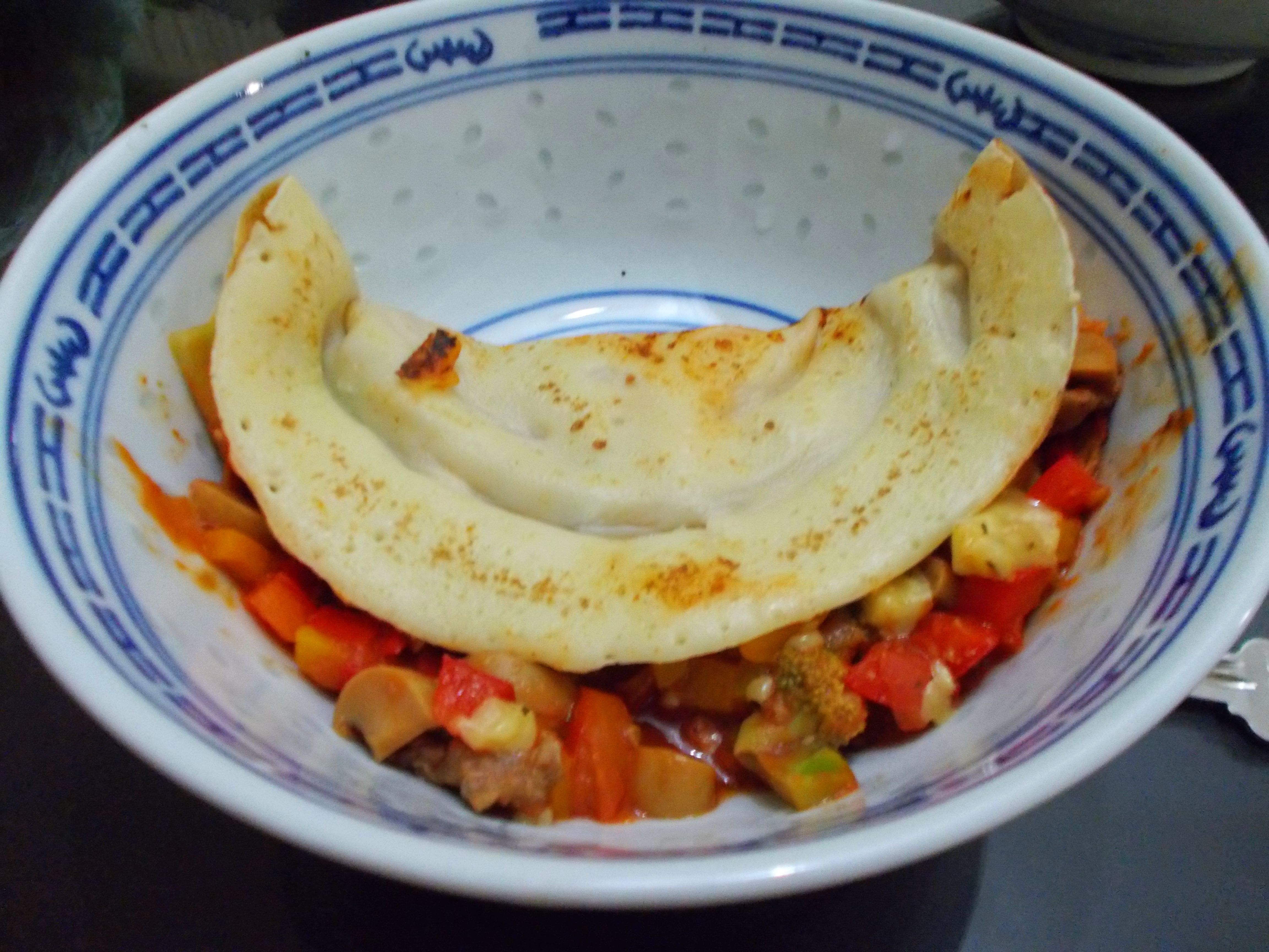 Dlatego też jedzenie podałam w miskach na zupę. Moją porcję pokroiłam nożem i jadłam łyżką, a współlokatorzy jakoś poradzili sobie używając wyłącznie łyżek i pałeczek. Sukces!