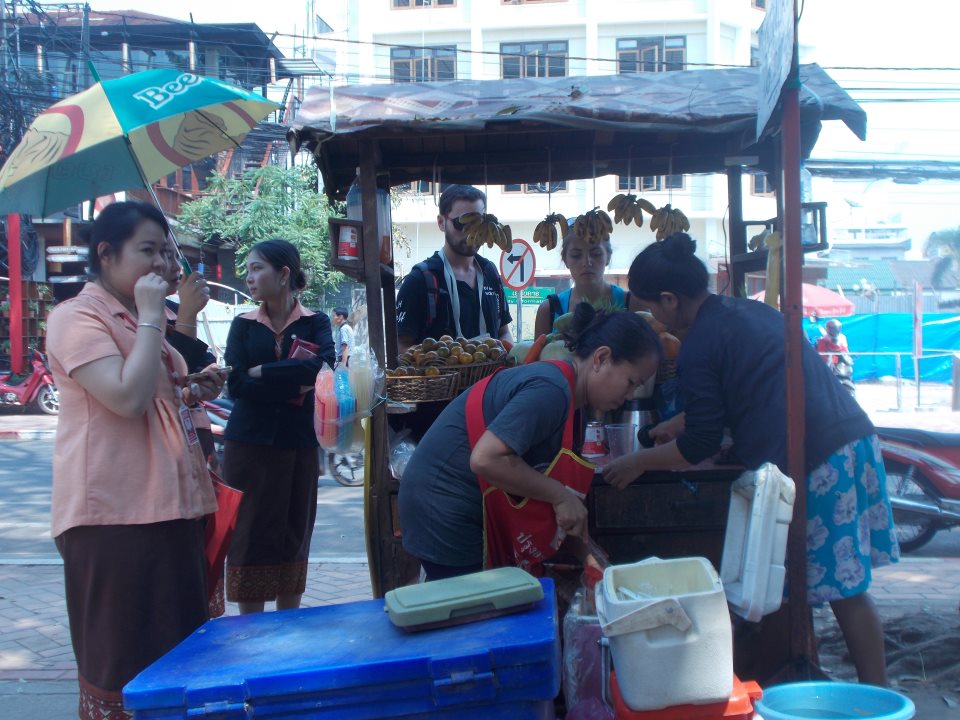Idąc dalej uliczkami Vientiane odkryłyśmy mój ulubiony azjatycki produkt uliczny made in Laos: świeżo wyciskane soki owocowe! Pyszne, świeże i tanie: ok 2 zł za kubek. Do wyboru: mango, jabłka, marchewki, arbuz, melon…. Czasem dokładają do soku mleko skondensowane, przez co sok staje się słodkim koktajlem. Całkiem w porządku, ale i tak nic nie przebije świeżego soku z mango – to jest po prostu mistrzostwo świata!