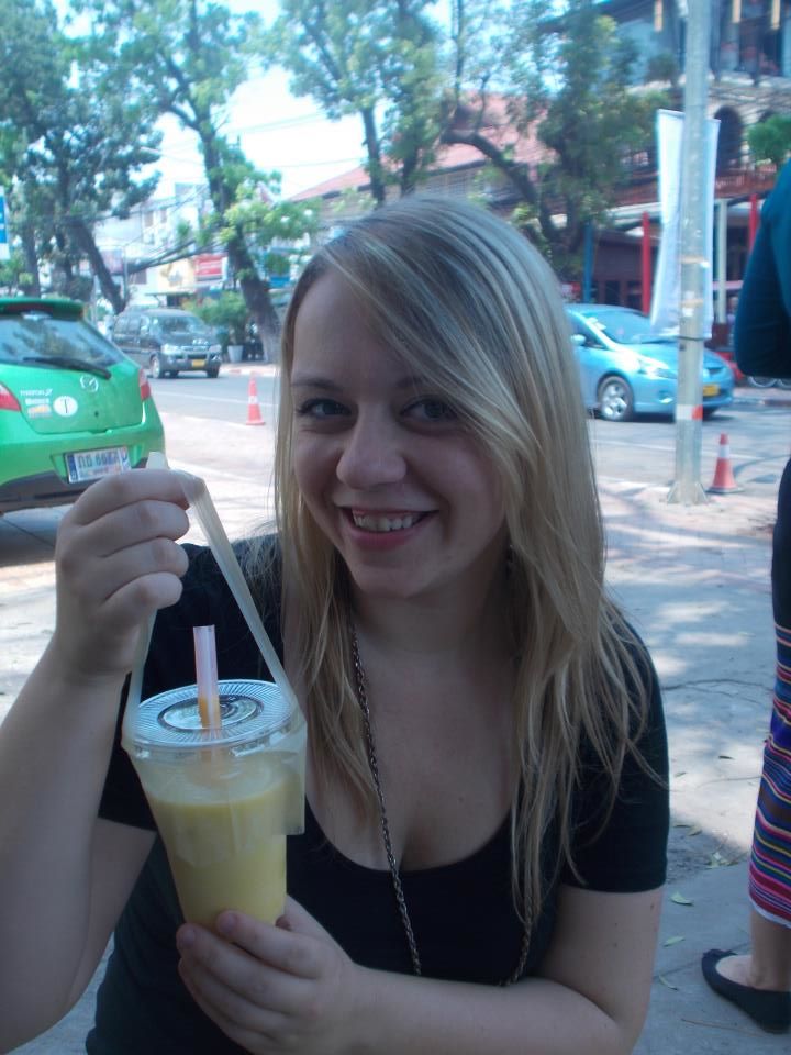 (poniżej ja z sokiem mango, Caroline z bananowym)