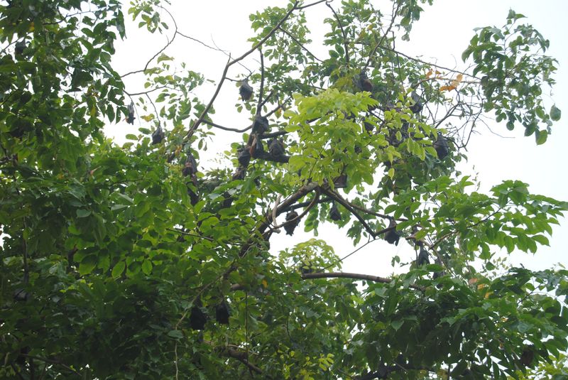 Wokół stołu kręciła się rodzina kotów a na okolicznym drzewie wisiały dziwne czarne ptaki, wydając wysokie dźwięki. Dopiero po chwili zauważyłam, że to nie ptaki, a nietoperze! Obwiesiły drzewo jak choinkę: