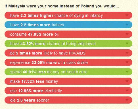 Na początek ciekawostka, którą znalazłam ostatnio: porównanie różnic w życiu, w sytuacji, gdyby Polak jednak urodził się w Malezji (szczególnie polecam spojrzeć na wskaźnik zatrudnienia)