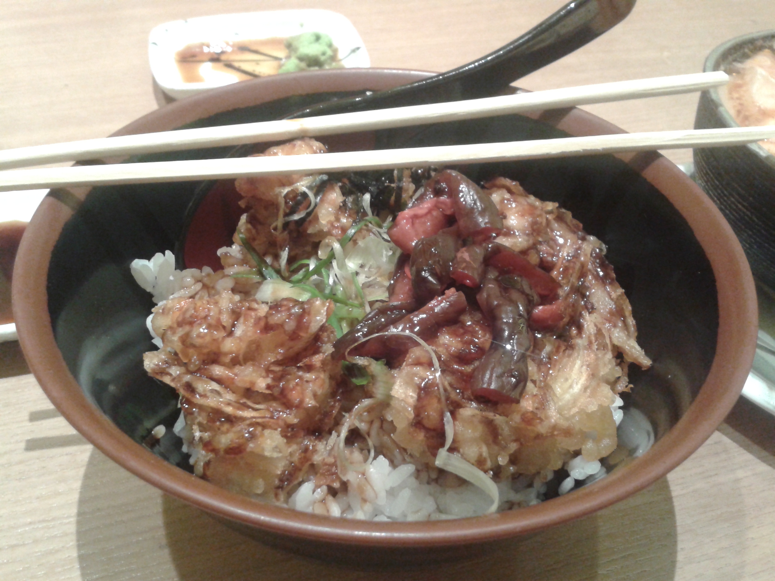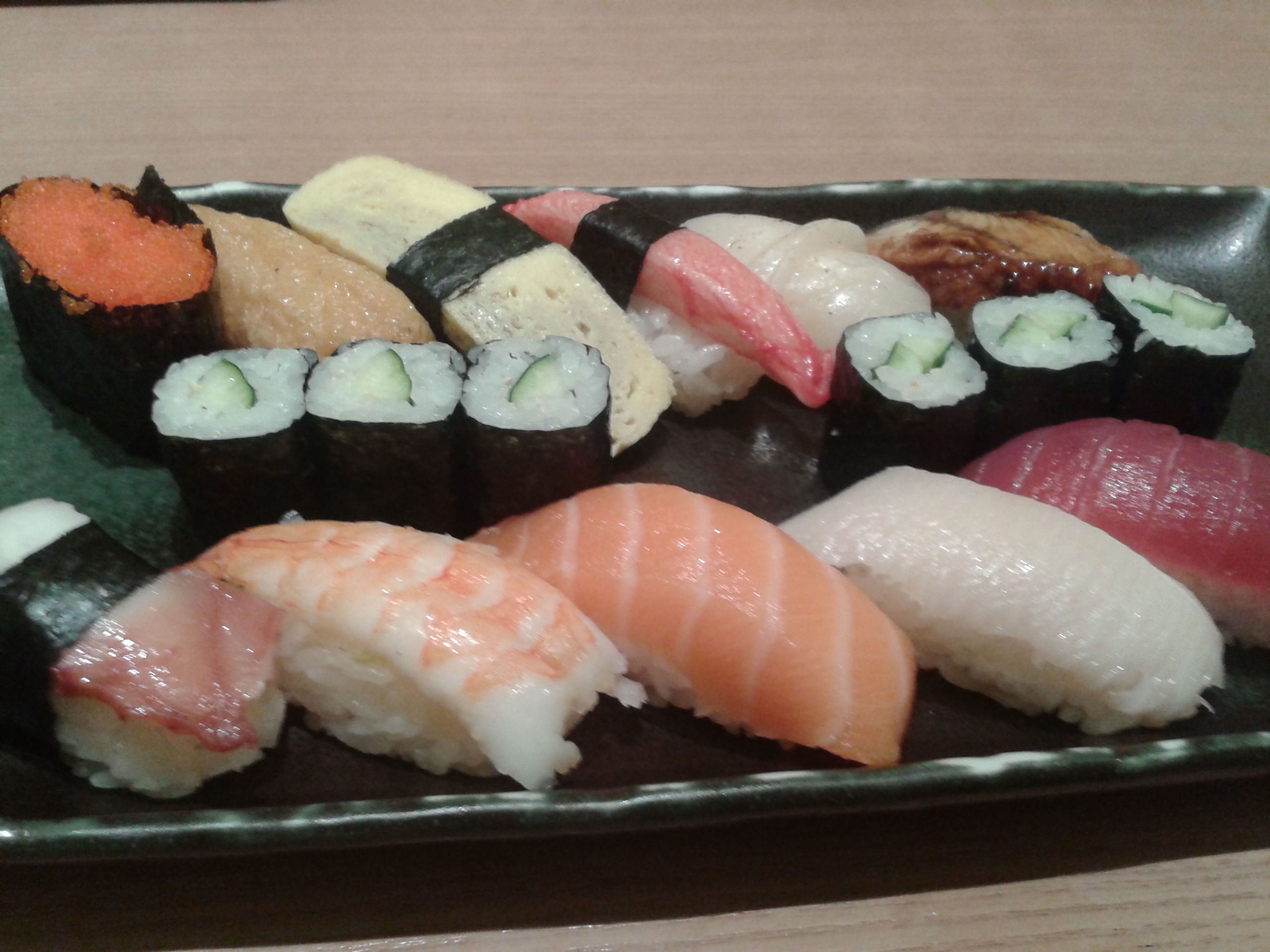 Pyszności! Zwłaszcza jeśli się wie, gdzie dostać tanie sushi (1,8 RM za talerzyk futomaki – 6 sztuk). Tu na przykład kolacja środowa, z kolegami z pracy – próbowałam m.in. surowego węgorza elektrycznego i głowy łososia (akurat głowy nie ma na zdjęciu, ale była pyszna – szczególnie policzki):