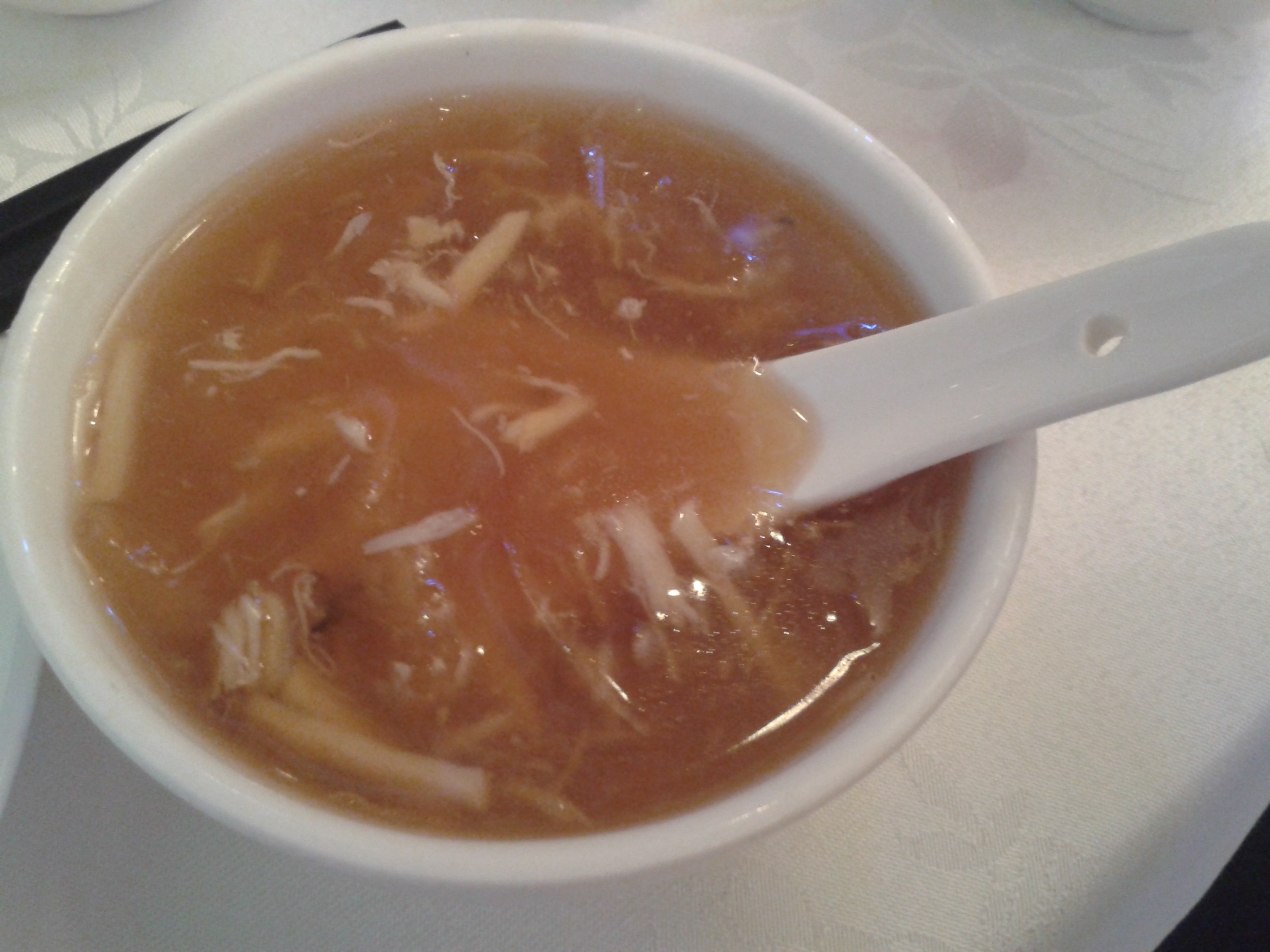 Zupa – z płetwy rekina, z dodatkiem mięsa z kraba. Nigdy wcześniej tego nie jadłam, bo to niestety mega-nieetyczne danie, jako, że rekiny w okolicach Malezji są zagrożone wyginięciem. W przypadku płetwy rekiniej, rybacy łowią je, odcinają płetwę na górze (charakterystyczny wystający ponad wodę trójkąt) i.. wypuszczają rekina z powrotem na wolność. Powoduje to powolną śmierć w cierpieniach, a zwierzę wykrwawia się po paru godzinach. Tym razem jednak, jako że nie miałam wyboru, spróbowałam – głównie dlatego, że jestem pewna że nigdy więcej tego dania nie spróbuję – przynajmniej nie zamówię tego z własnej woli.
