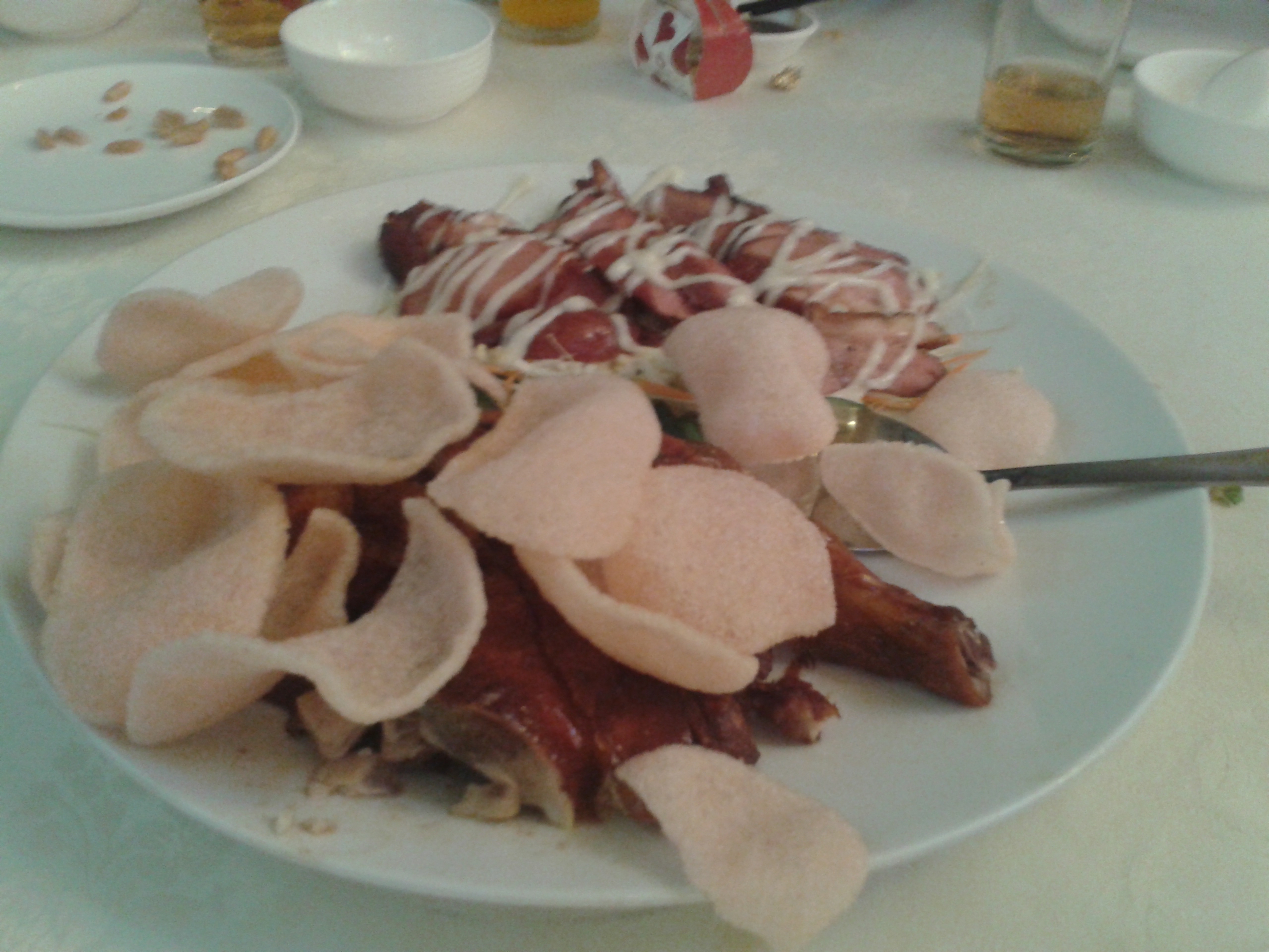 Po wejściu panny młodej zaserwowano kolejne danie – kurczaka i wieprzowinę z rusztu, z chipsami krewetkowymi i sałatką. Dobre, ale nic szczególnego. Do tego kelnerzy co chwilę dolewali do szklanek i kieliszków chińską herbatę i wino, idealnie komponujące się z jedzeniem.