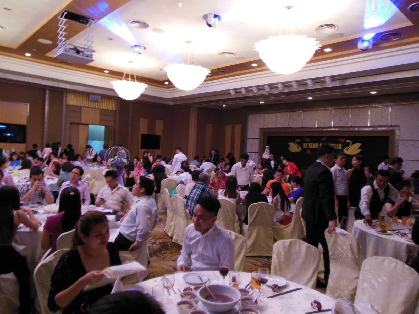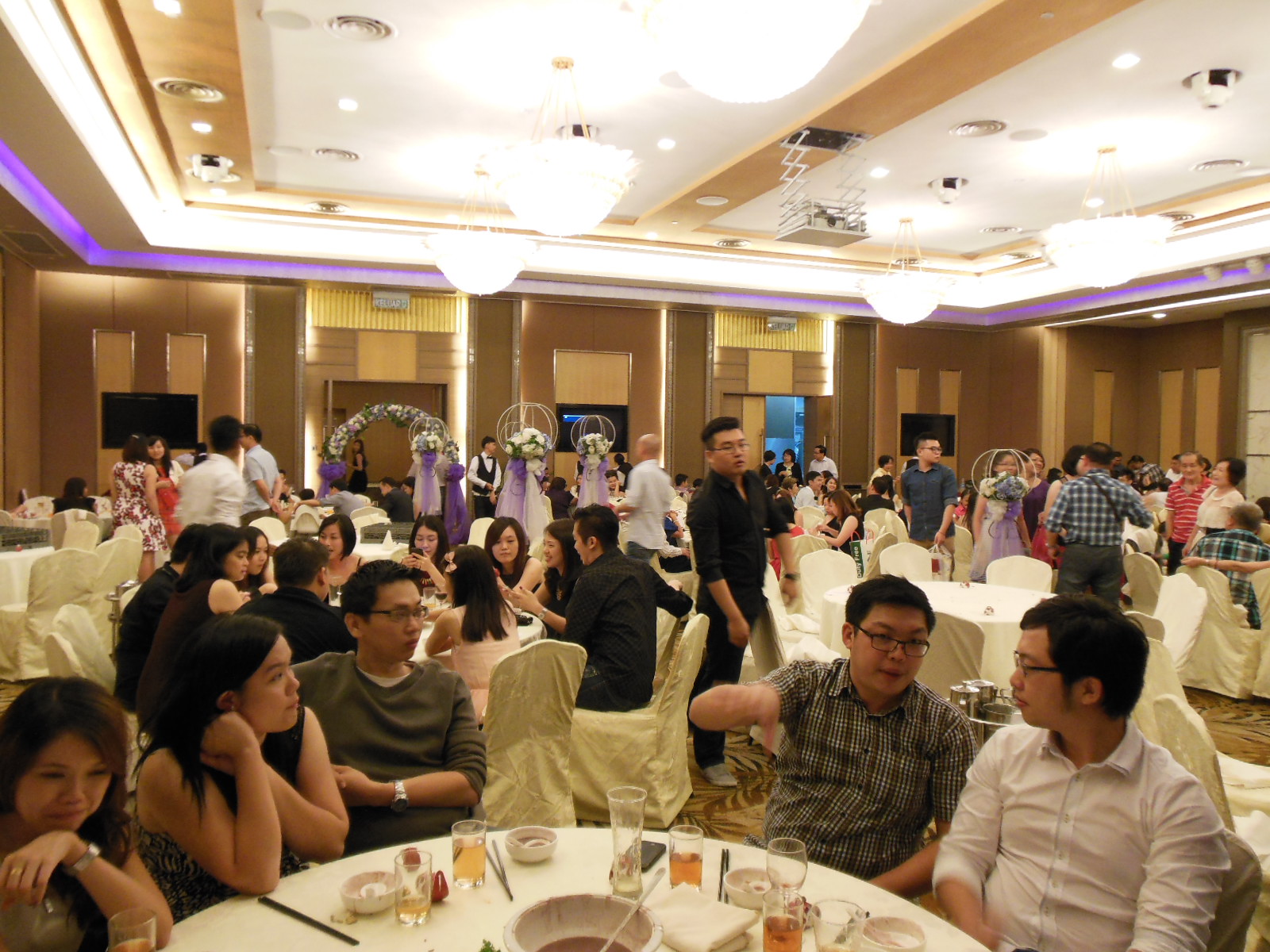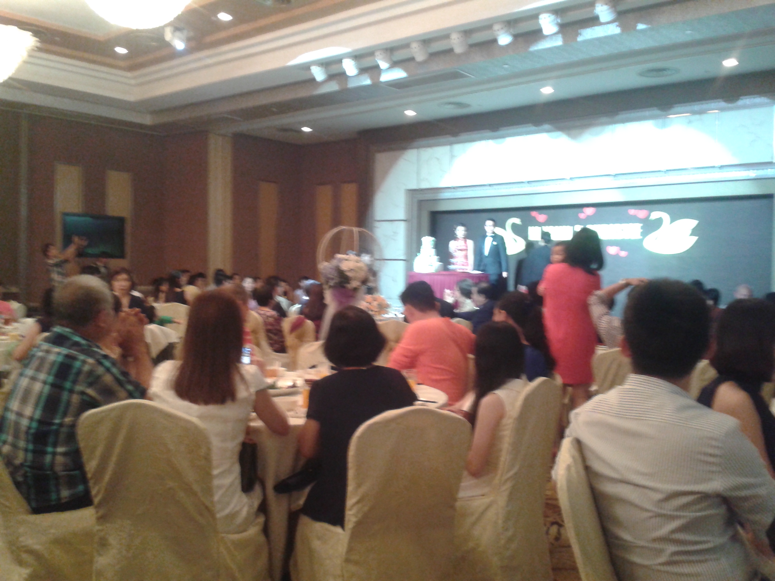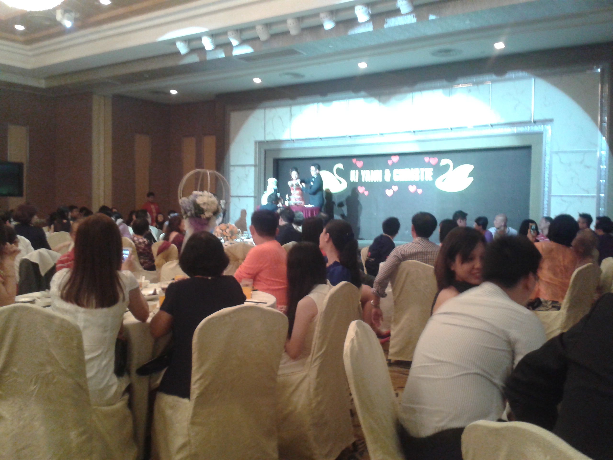 Zaraz potem przyszedł czas na toasty. Na scenę zaproszono parę młodą wraz z najbliższą rodziną, po czym prowadzący/wodzirej podpytywał młodych o to, gdzie się poznali, żartował z nich i zachęcił do pocałunku (co zresztą zrobili, inaczej niż na weselu Malajskim). Następnie para młoda nalała szampana do stojących na stole kieliszków. Chwilę potem wszyscy stojący na scenie zaczęli krzyczeć „Yung sing”, czyli „Na zdrowie” (dosł. tłum. wypij i wygrywaj). Brat panny młodej zdecydowanie ledwo trzymał się na nogach, no i wykrzykiwał toasty najgłośniej ze wszystkich 🙂
