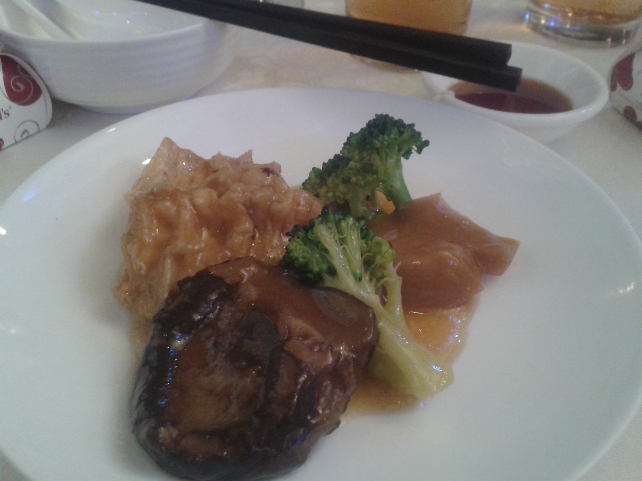 Dopiero co rozbroiłam krewetkę, a na stół wjechał kolejny talerz – tym razem ze smażonymi organami ryby – mówię tu o rybnych flakach, podanych z chińskimi grzybami i brokułami. Nie skupiając się na pochodzeniu ryby, w sumie smakowało to całkiem ok i nie śmierdziało. Tylko grzyby trochę twarde.