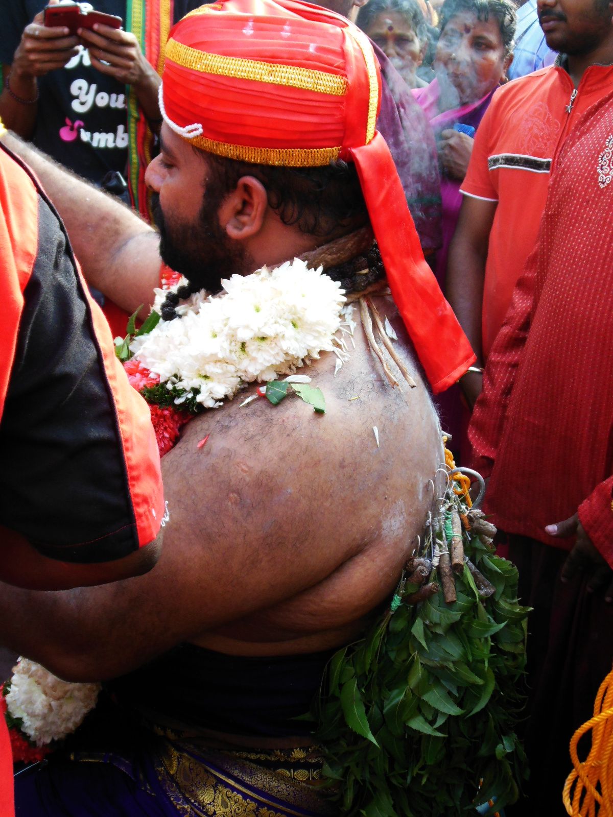 *jest też sporo pielgrzymów którzy biorą dziękczynienie dosłownie i kultywują tradycję umartwiania ciała poprzez wbijanie w plecy haków z obciążnikami jak kokosy czy limonki. Niektórzy przebijają policzki i języki trójzębami (symbol Lorda Murgam), lub przebijają nos wielkimi kolczykami. Co ciekawe – nigdzie nie ma krwi.
