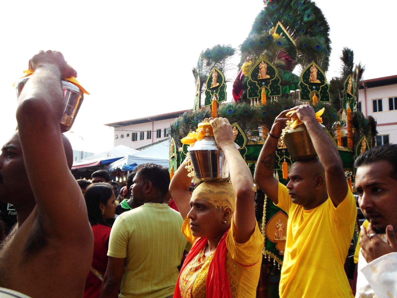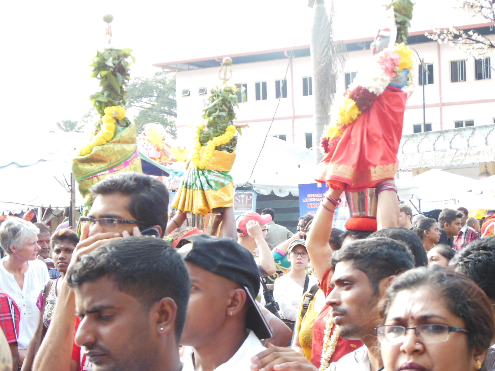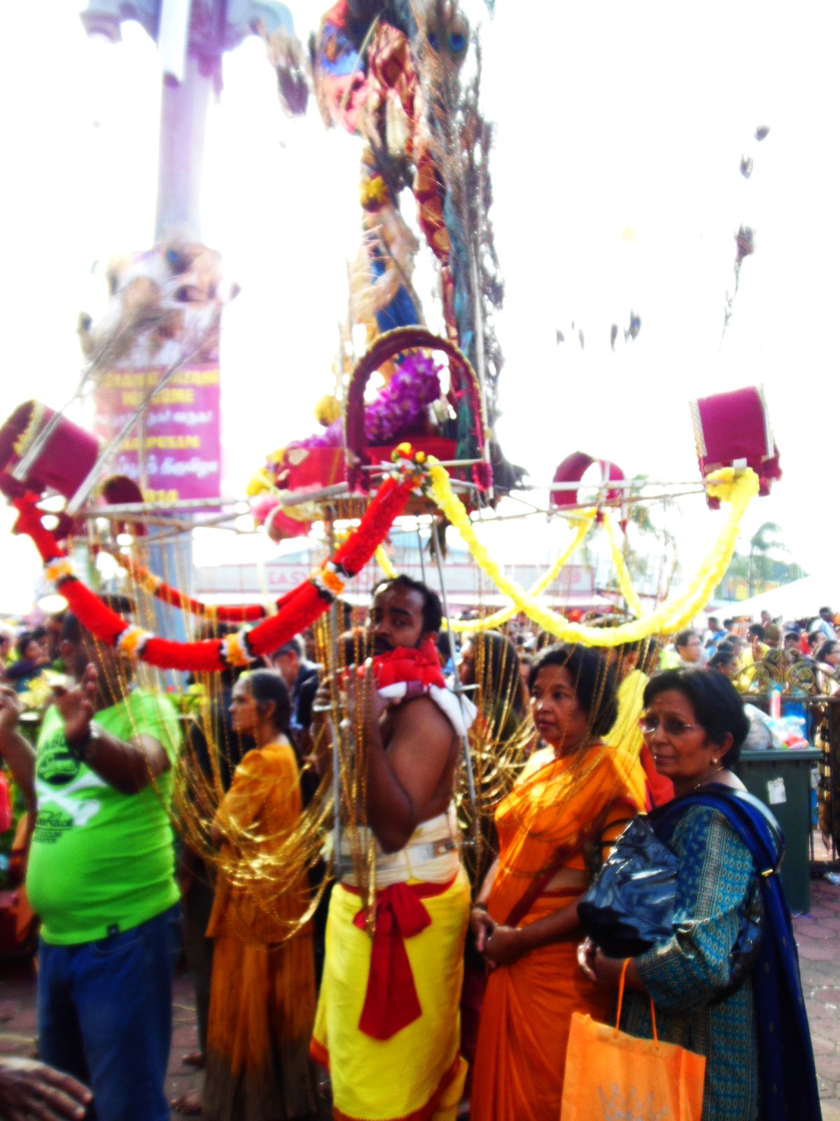 *dziękować bogu można w różny sposób – najbardziej popularny to piesza pielgrzymka ze świątyni przy Petaling Street do Batu Caves (ok 15 km), idzie się boso, w pomarańczowej szacie, a na głowie lub ramieniu trzyma się dzban pełny mleka, które później ofiarowuje się w świątyni. Maszeruje się za wielkim powozem, na którym wieziony jest święty posąg. To właśnie ten powóz:
