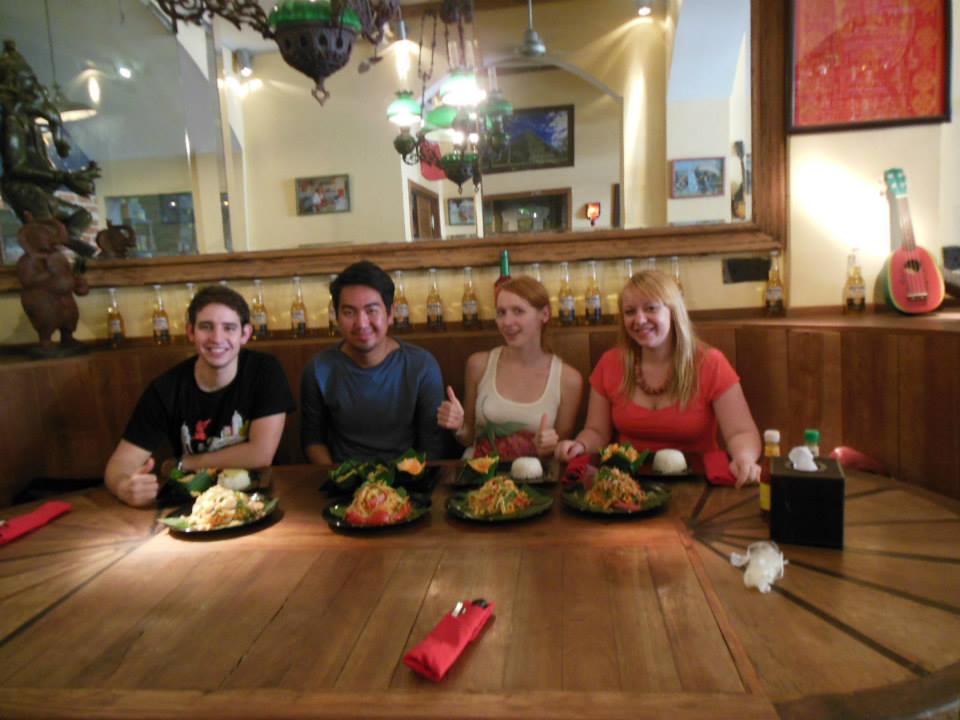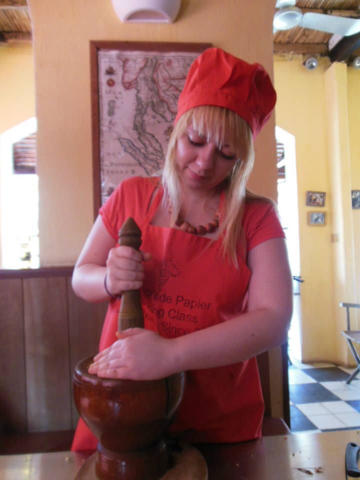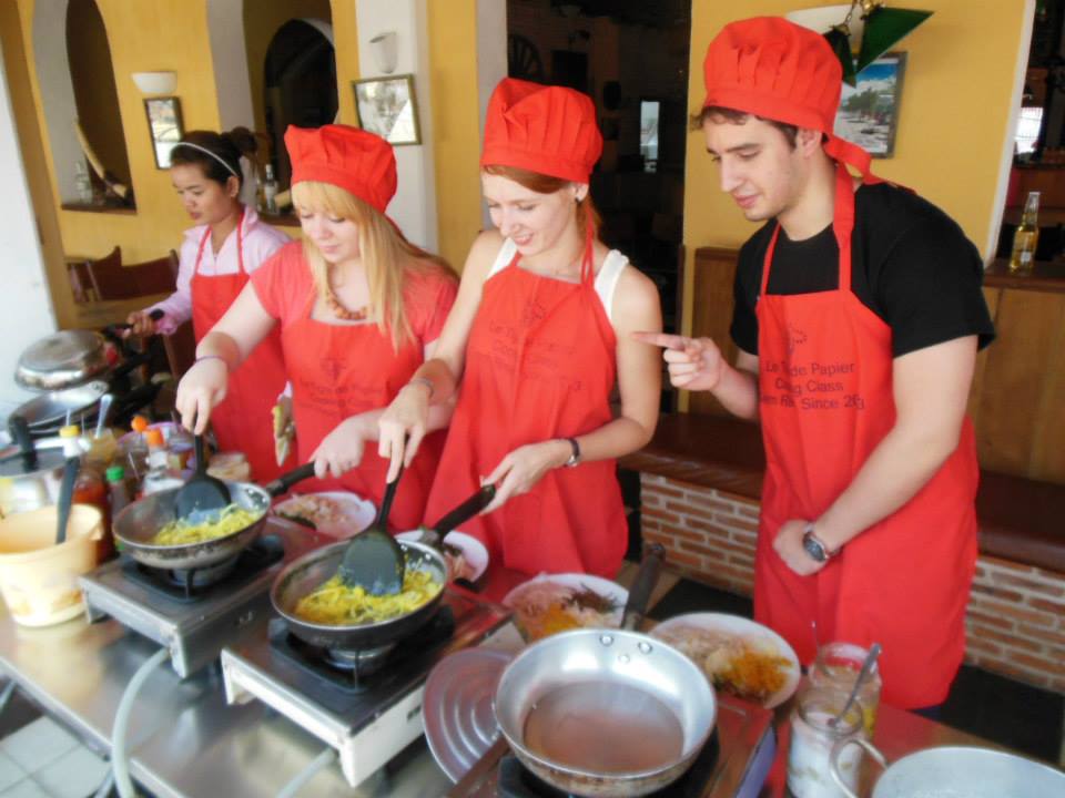 Na Pub Street można znaleźć kilka restauracji oferujących lekcje, ale ja zdecydowanie polecam Le Tigre de Papier – cena w porządku, gotuje się przystawkę, danie główne i deser, a na samym początku nauczycielka zabiera całą grupę na targ owocowo-warzywny. Na początku wybiera się dania, które chce się ugotować: ja wybrałam sałatkę z kwiatu bananowca i zielonego mango, daniem głównym był amok z owocami morza, a na deser kuleczki sago w mleczku kokosowym.