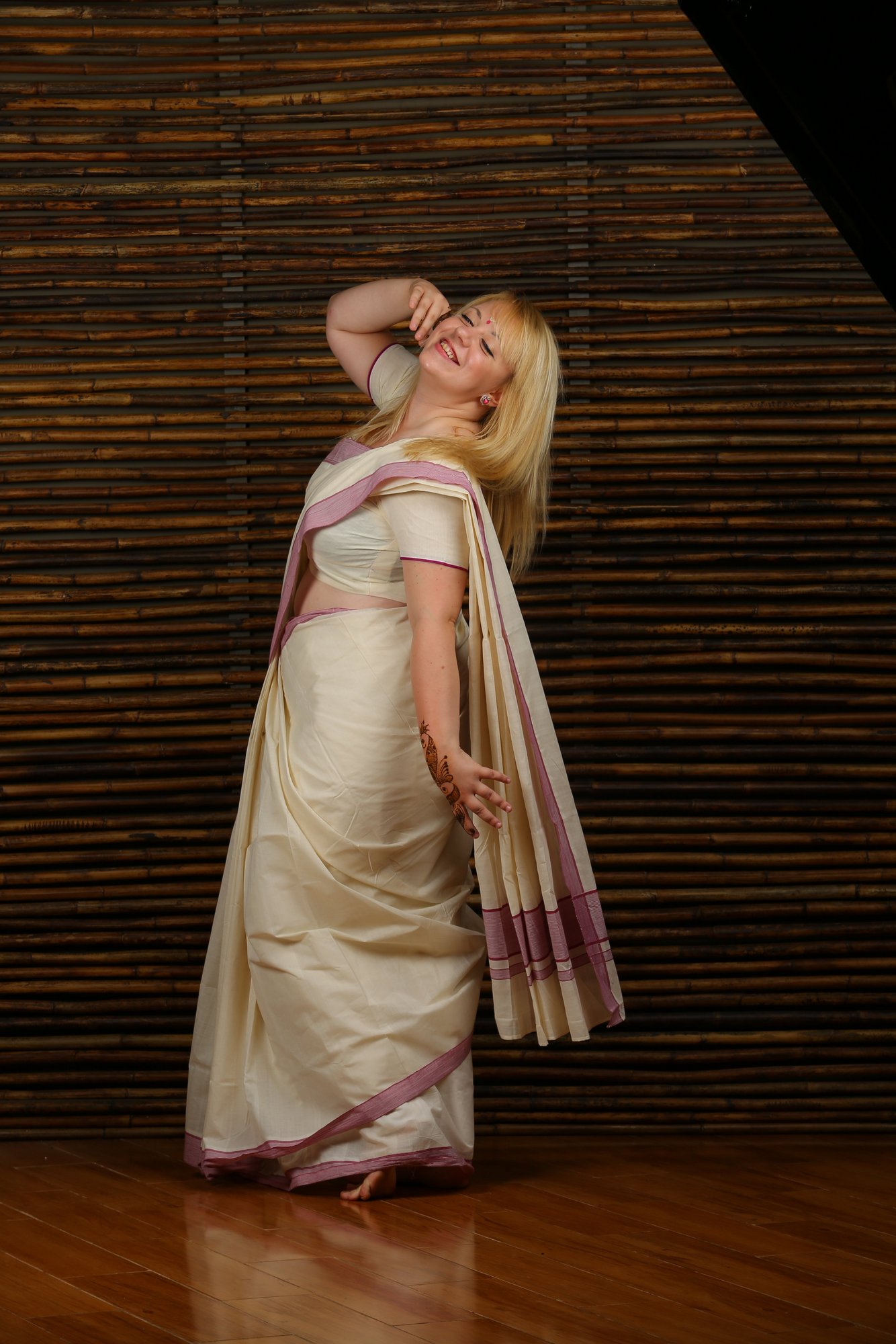 W Kerali wygląda to trochę inaczej – tradycyjne sari jest zaskakująco proste. Składa się z kremowego materiału ze złotym brzegiem. Sam materiał jest dość ciężki i trudny w układaniu, coś jak prześcieradło. Pod spód zakłada się długą białą spódnicę i krótką bluzeczkę – choli, która odsłania brzuch.