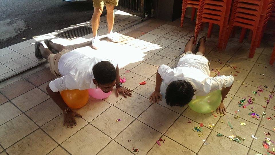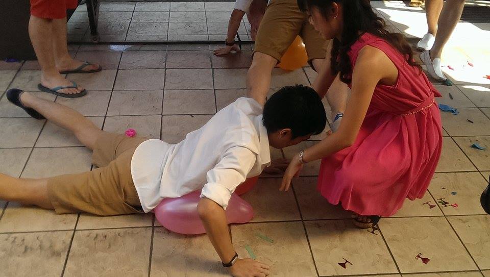 Drugim zadaniem było nadmuchanie balonów i położenie ich pod sobą na ziemi, a następnie zrobienie pompki w ten sposób, aby przebić balon siłą swojego ciała. Tu nieco nawaliła logistyka: balony pękały same z siebie, a niektóre trzymały się tak mocno, że musieliśmy przyciskać ciała chłopaków rękami, naciskając na ich plecy, żeby przebić balon. Ale jakimś cudem – udało się!