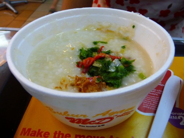 Bubur ayam, czyli ryżowy kleik na wodzie, z kawałkami kurczaka, szczypiorku i kawałkami chilli. Tego typu owsianka, czyli bubur, jest serwowana jako typowe śniadanie w większości chińsko-malezyjskich domów, można ją też dostać na ulicy. Azjaci bardzo ją lubią i znam przypadki, gdzie ludzie z Filipin czy Tajwanu podczas pobytu w Malezji na śniadanie jedli tylko to w Mcdonaldzie przez cały pobyt. Ja tam nie przepadam, dla mnie ta owsianka jest bez smaku, ale to całkowicie kwestia gustu. Rano można zamówić bubur ayam w zestawie z kawą lub herbatą, jest to jedna z najtańszych opcji na śniadanie.