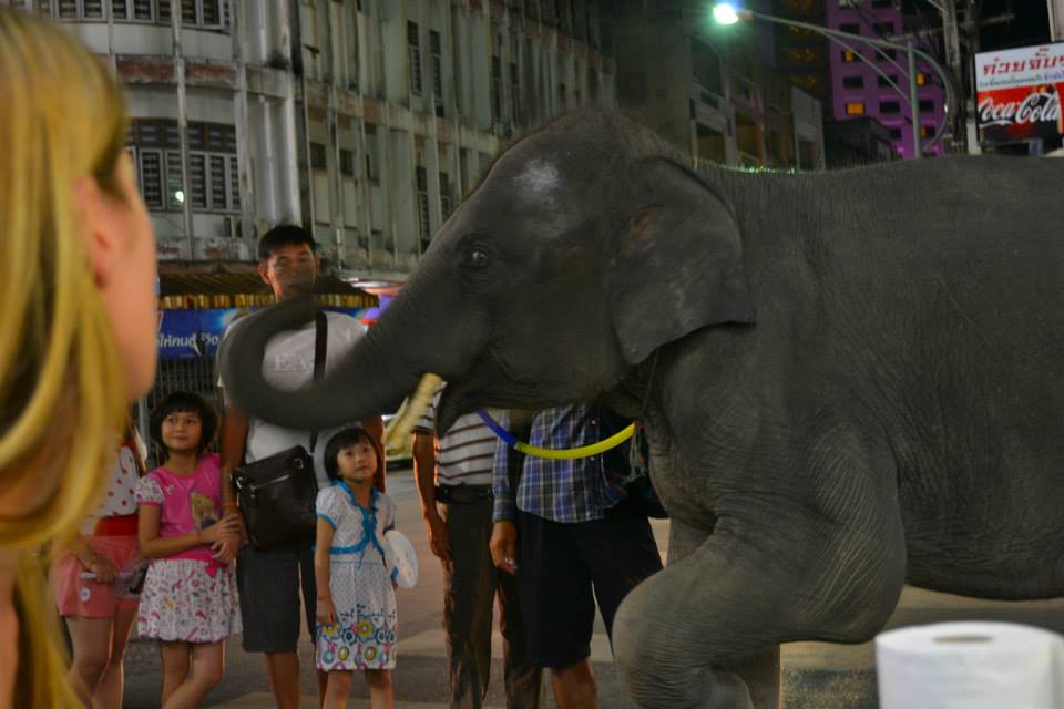 Powszechne - niestety - zjawisko w Tajlandii. Właściciel prowadzi słonia ulicami w dzielnicy turystycznej i każe sobie płacić za zdjęcie ze słonikiem. Przerażające - jeden z gorszych przypadków wyzyskiwania dzikich zwierząt, jaki do tej pory widziałam.