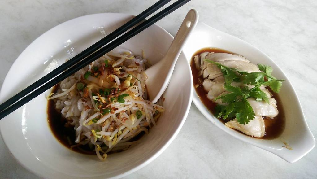 Najbardziej słynna potrawa z malezyjskiego miasta Ipoh – kurczak na parze (kway teow steamed chicken), a do tego cienkie kluski ryżowe z kiełkami soi w sosie sojowym, a wszystko posypane prażoną cebulką.