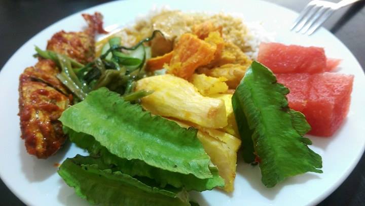 Wyjazd na miasto i wizyta w wiosce aborygenów (o tym już niedługo!), więc jedzenie było też nie-miejskie. Z bufetu wybrałam sobie co ciekawsze kąski: sos curry, słodkie ziemniaki, w całości smażona ryba, podana w sosie chilli, do tego szpinak wodny (kangkung), rodzaj lokalnego białego ziemniaka oraz „skrzydlata fasola” (kacang botol), na którą lokalnie mówi się „szpinakowy groszek” – i coś w tym jest! Podaje się to warzywo na surowo, tylko pokrojone na kawałki.