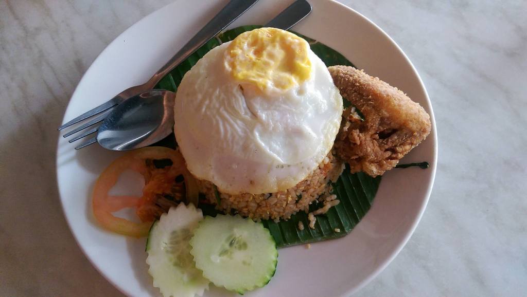Nasi goreng kampung (tłum. ryż smażony po wiejsku), czyli ryż z papryczką chilli, szpinakiem wodnym (zwanym tu kangkung), jajkiem i anchois (ble!). Do tego jajko z patelni na górze i skrzydełko z kurczaka na boku. Je się przyjemnie, ja się tylko trochę męczyłam, bo wygrzebywałam wszystkie malutkie anchois z ryżu. Co jak co, ale akurat ten składnik jest przeze mnie mało lubiany.
