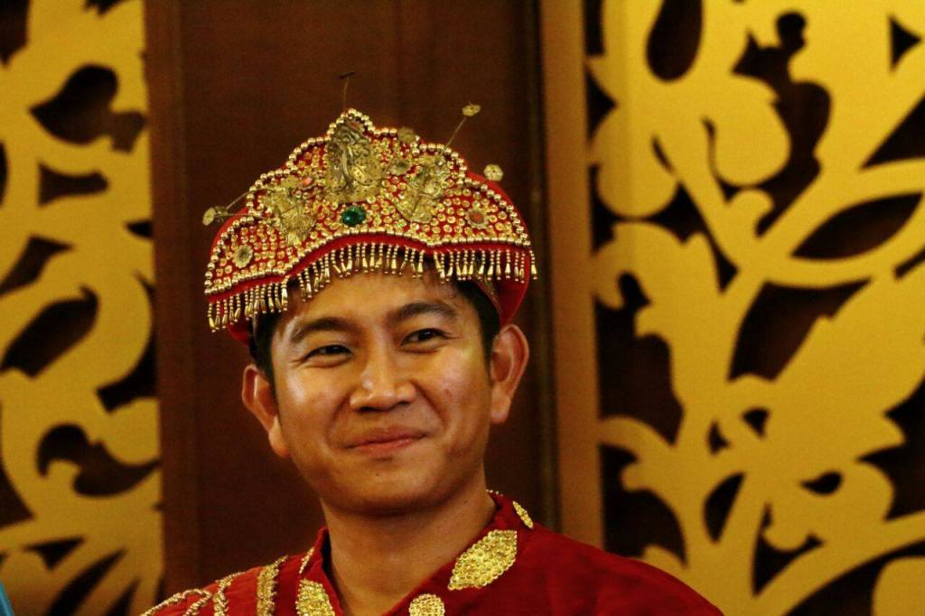 Pan młody miał na sobie pasujący strój – welurową czerwoną tunikę, sarong i złotą szarfę, a na głowie pasujące nakrycie głowy.