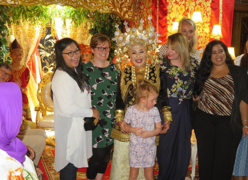 Celebrację rozpoczyna wieczór „ceremonii henny” czyli kobieca uroczystość będąca swoistym odpowiednikiem wieczoru panieńskiego. Kobiety z rodziny i kręgu przyjaciół razem jedzą kolację (w menu m.in. indonezyjski rosół – soto ayam), po czym są po kolei wywoływane na scenę lub ganek gdzie siedzi przyszła panna młoda. Każda z kobiet nakłada na wybrany paznokieć panny młodej nieco henny i składa życzenia pomyślności. Plus, jest to oczywiście okazja do zrobienia sobie selfie 🙂 Była to najmniej „formalna” uroczystość ze wszystkich – ale i tak odwiedzające kobiety ubrane były w raczej odświętne stroje, błyszczące diamencikami hidżaby a także mocny makijaż. Wiadomo, do zdjęć trzeba się odpowiednio prezentować. To wydarzenie było o tyle szczególne, że nietypowo, brali w nim udział mężczyźni z najbliższej rodziny – przez to że na uroczystości pojawili się goście z całego świata, postanowiono nieco „nagiąć” tradycję.
